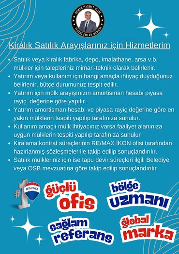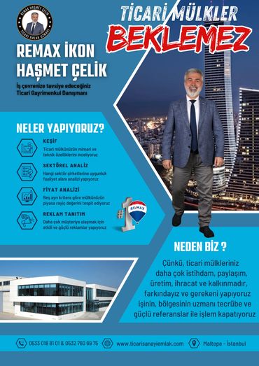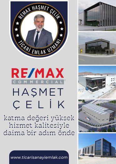 RE/MAX Haşmet Çelik, hafif çelik prefabrike yapılar sektöründen emekli Makina mühendisidir. İstanbul Asya yakası OSB'ler ve çevresinde ticari ve sanayi emlak hizmetleri ve çözümleri sunmaktayız. Satılık ve Kiralık; Fabrika, Depolama, İmalathane, Atölye, Dükkan, Mağaza, İş Hanı, Tower, Plaza, Komple Ticari Bina v.b. emlak ihtiyaçlarınızda profesyonel hizmet sunmak için bir tık kadar yakınınızdayız. Gayrimenkul Acentesi; Fabrika, Depo, Dükkan, Mağaza, Plaza, Ticari Arsa;