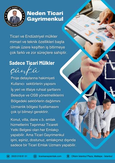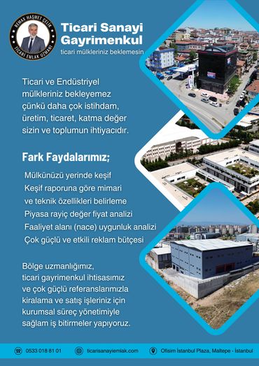 Ticari ve Sanayi Emlak işlerinizde hızlı ve sağlam sonuçlar almak istiyorsanız arayın görüşelim, çağırın tanışalım... Fabrika, Depo, Mağaza, Plaza, Dükkan, Atölye, Ticari Arsa v.b. mülkleriniz için keşif, fiyat ekspertizi, pazarlama, satış, kiralama hizmetleri sunuyoruz. Ticari sanayi Emlak; Gayrimenkul Acentesi